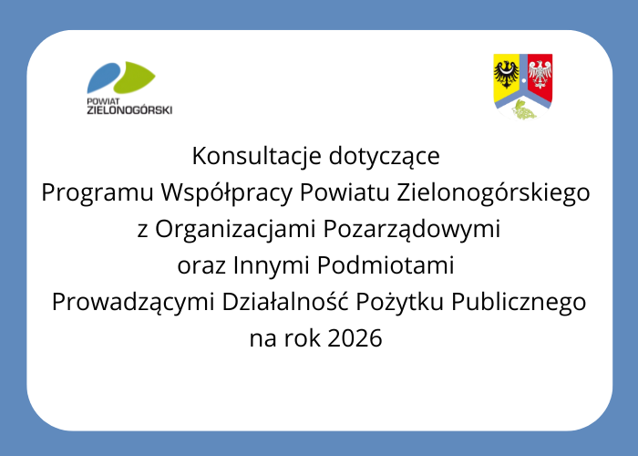 Ogłoszenie o konsultacjach dotyczących Programu Współpracy Powiatu Zielonogórskiego z Organizacjami Pozarządowymi oraz Innymi Podmiotami Prowadzącymi Działalność Pożytku Publicznego na rok 2026. Szczegóły w linku poniżej. https://bip.powiat-zielonogorski.pl/125/3071/Ogloszenie_o_konsultacjach_dotyczacych_Programu_Wspolpracy_Powiatu_Zielonogorskiego__z_Organizacjami_Pozarzadowymi_oraz_Innymi_Podmiotami_Prowadzacymi_Dzialalnosc_Pozytku_Publicznego_na_rok_2026/ [...]