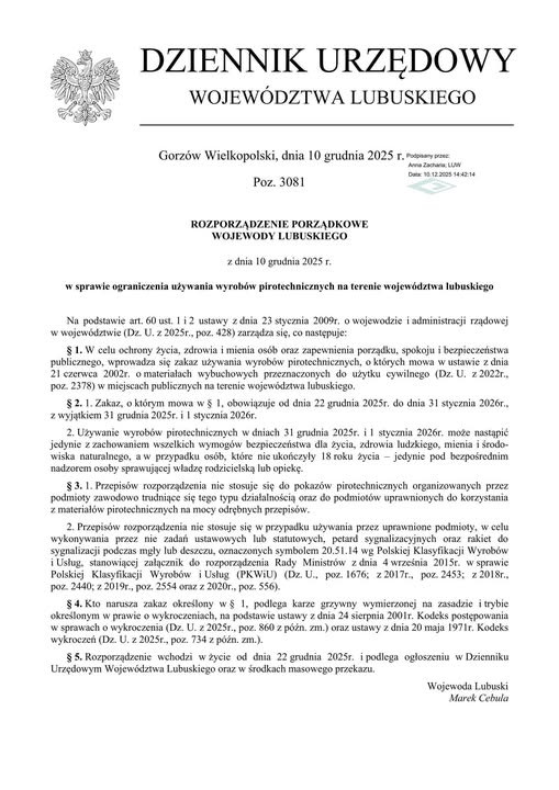 ROZPORZĄDZENIE PORZĄDKOWE WOJEWODY LUBUSKIEGO z dnia 10 grudnia 2025 r. w sprawie ograniczenia używania wyrobów pirotechnicznych na terenie województwa lubuskiego. Obowiązuje od nia 22 grudnia 2025 r. do dnia [...]