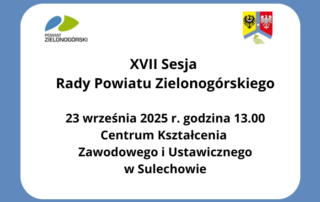 23 września br. o godz. 13:00 w Centrum Kształcenia Zawodowego i Ustawicznego (warsztaty szkolne) w Sulechowie, przy ul. Piaskowej 53 odbędzie się XVII sesja Rady Powiatu Zielonogórskiego. Porządek obrad: 1. Otwarcie XVII Sesji Rady [...]