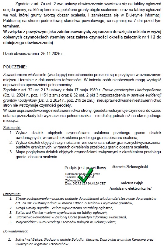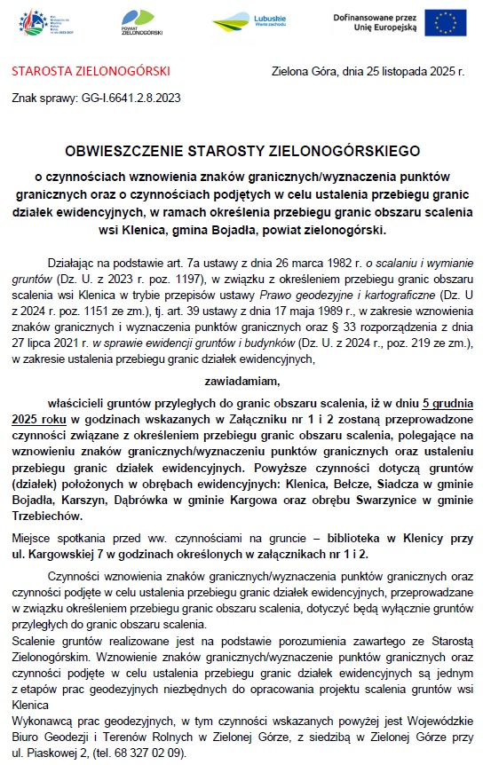 Obwieszczenie Starosty Zielonogórskiego o czynnościach wznowienia znaków granicznych/wyznaczenia punktów granicznych oraz o czynnościach podjętych w celu ustalenia przebiegu granic działek ewidencyjnych, w ramach określenia przebiegu granic obszaru scalenia wsi Klenica, gmina Bojadła, powiat zielonogórski
