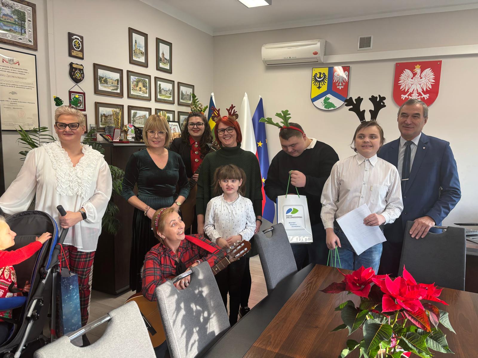 Spotkanie ze Starostą Zielonogórskim Tadeuszem Pająkiem oraz Wicestarostą Zielonogórską Agnieszką Szeląg miało przede wszystkim świąteczny charakter. Był to czas wspólnego kolędowania przy akompaniamencie gitary. Ale była to również okazja do zobaczenia urzędu „od kuchni”.