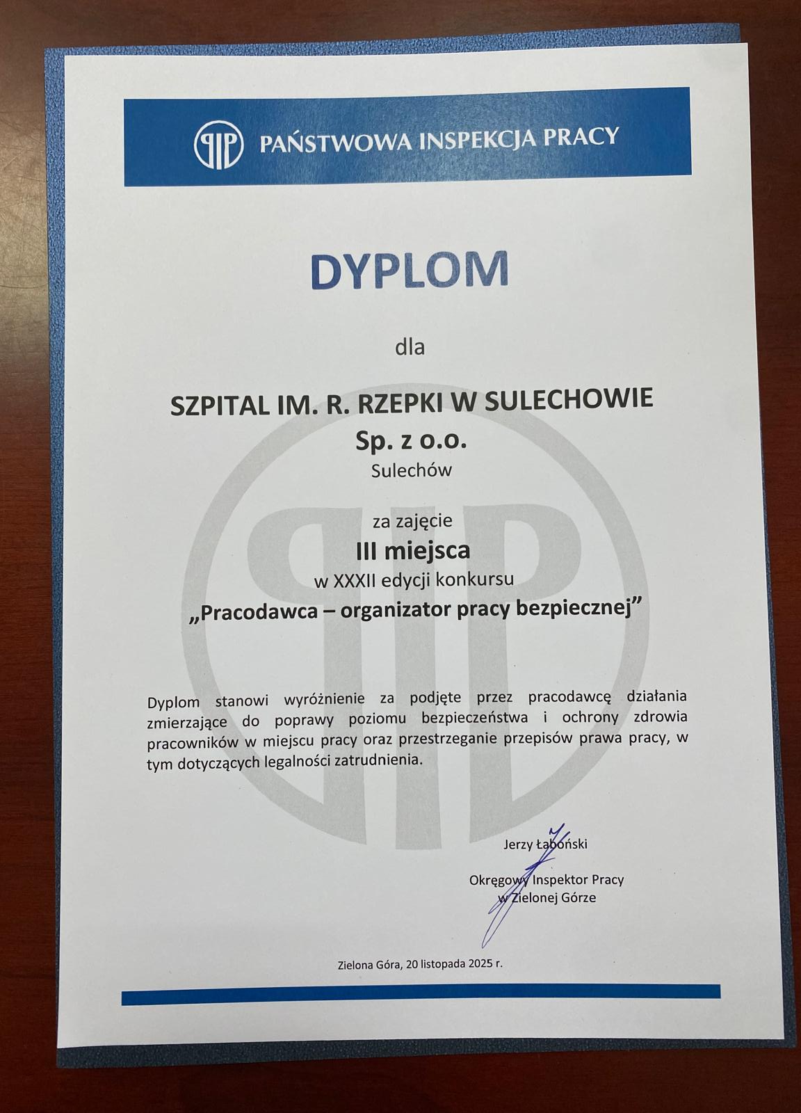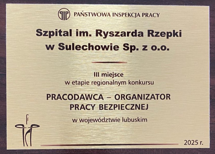 Szpital im. Ryszarda Rzepki w Sulechowie na podium konkursu „Pracodawca- Organizator Pracy Bezpiecznej”.