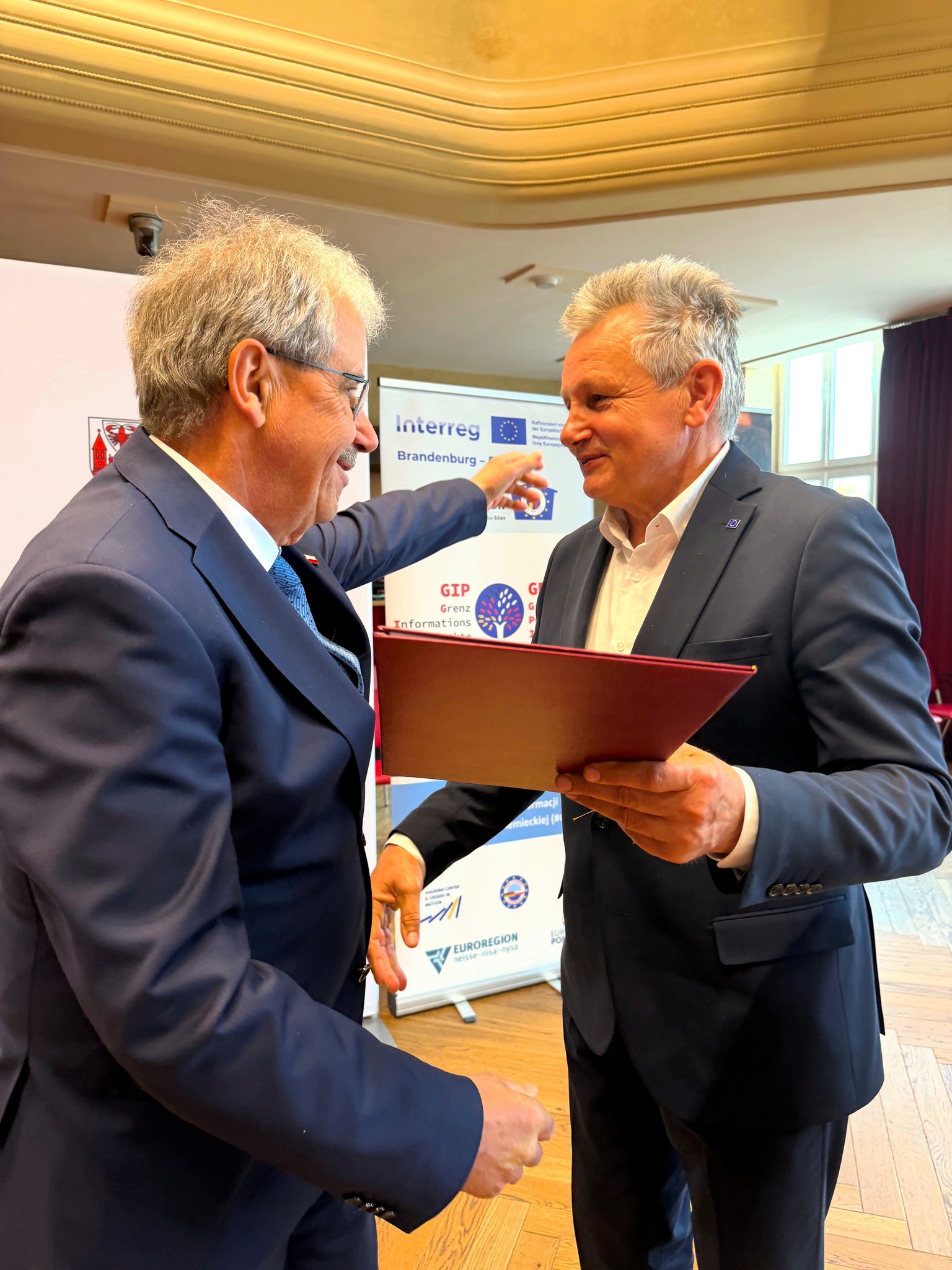 Starosta zielonogórski Tadeusz Pająk podziękował Haraldowi Altekrugerowi za wieloletnią, bardzo dobrą współpracę. Podkreślił, że partnerstwo powiatów zielonogórskiego i Sprewa-Nysa stanowi niezwykle cenną wartość, szczególnie w kontekście rozwoju społecznego, kulturalnego i gospodarczego regionu pogranicza. Współpraca obu powiatów to budowanie trwałych i przyjaznych relacji polsko-niemieckich. Starosta pogratulował również nowowybranemu prezydentowi euroregionu Tobiasowi Schickowi i wyraził przekonanie, że jego kadencja przyniesie dalsze umacnianie współpracy oraz kolejne cenne inicjatywy.